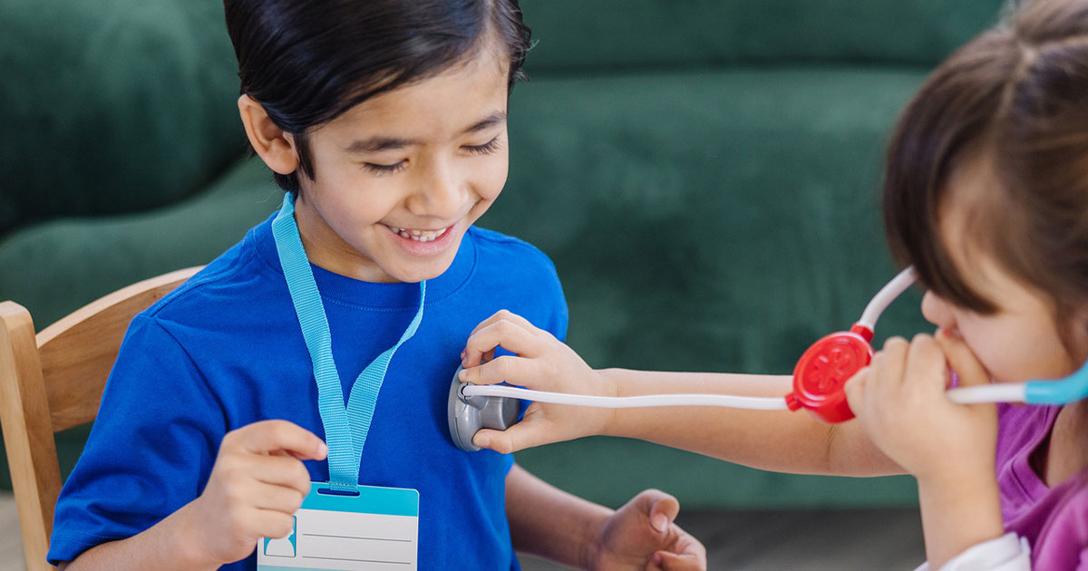 Play tips: Use upcoming events and activities as a springboard for imaginary play. Doing so is a great way to help children develop the confidence they need to navigate real-world situations on their own. Encourage your kids to explore new scenarios with you. Before going to a doctor's appointment, urge them to play pretend doctor to make the visit less scary. Or, before their first day of school, play classroom with them to get them in the right mindset and ease any anxiety they might be feeling. You can even help them learn what to do in future social situations, such as how to navigate a friend wanting to switch roles or play with their toy.