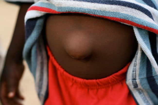 The most common sign of an umbilical hernia is a bulging of the belly button. The bulge will typically come and go. It may be large when your child is straining or crying. When your child relaxes, the bulge may go away. At times, the bulge may stretch the skin as the hernia becomes bigger.