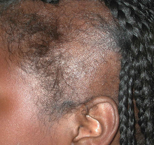 traction alopecia. It can get better by changing to looser hair styles. Avoiding caps and other things that constantly rub on the scalp can also help the hair grow back.