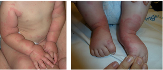 It is common for young children with hives to also get swelling of the hands and feet. This can be uncomfortable, and can cause the child to be fussy and unhappy.