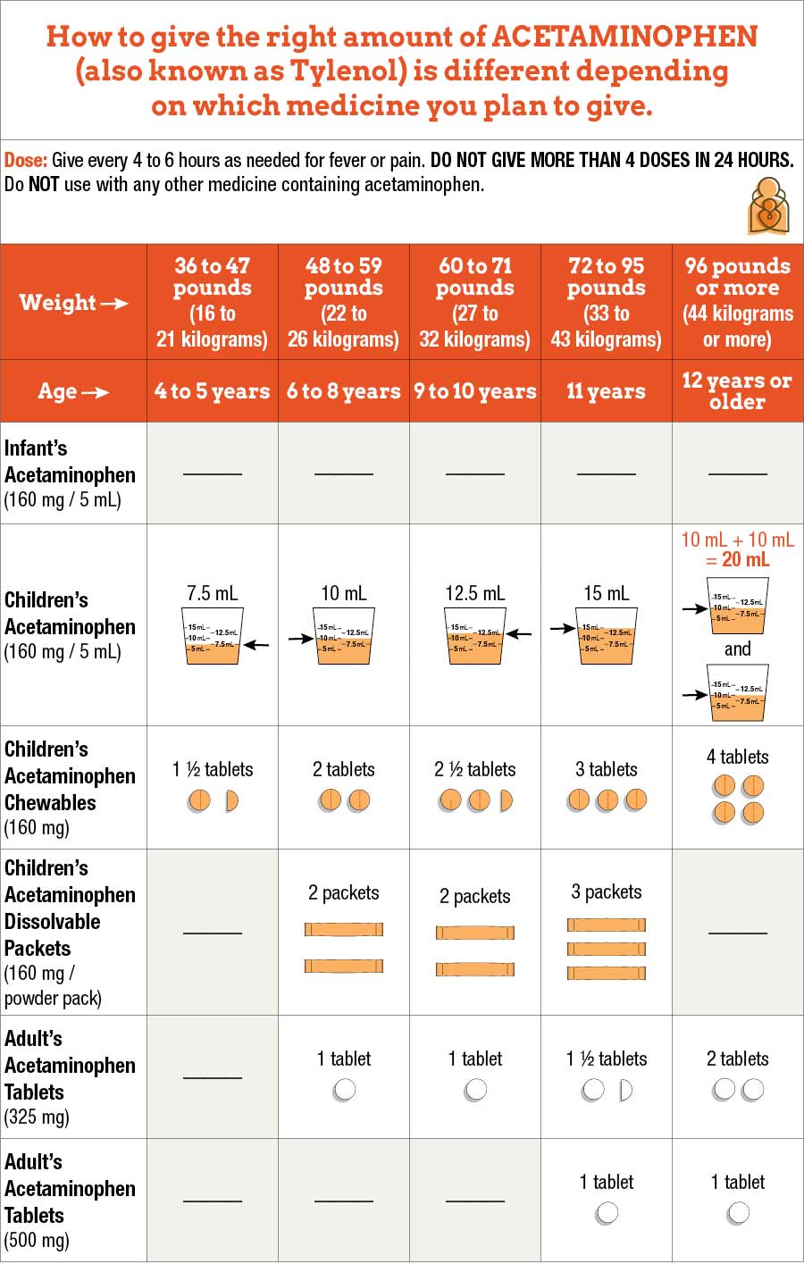 The tables* below can help you figure out the right amount to give. (Find a print-friendly version here​.) Use your child’s weight to decide on the right amount to give. If you do not know your child’s weight, use your child’s age. Be sure to check with your child’s doctor to make sure you are giving the right amount.
