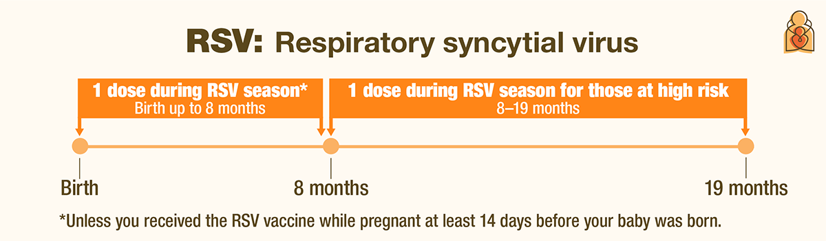 Respiratory syncytial virus (RSV) is usually common in the late fall through early spring months. This virus is the top cause of hospitalization for babies. There are two immunizations now for babies and some toddlers. One is an RSV vaccine given during pregnancy. You can get it when you are 32 through 36 weeks pregnant and you are expecting your baby during RSV season. The other option is an RSV immunization. Learn more