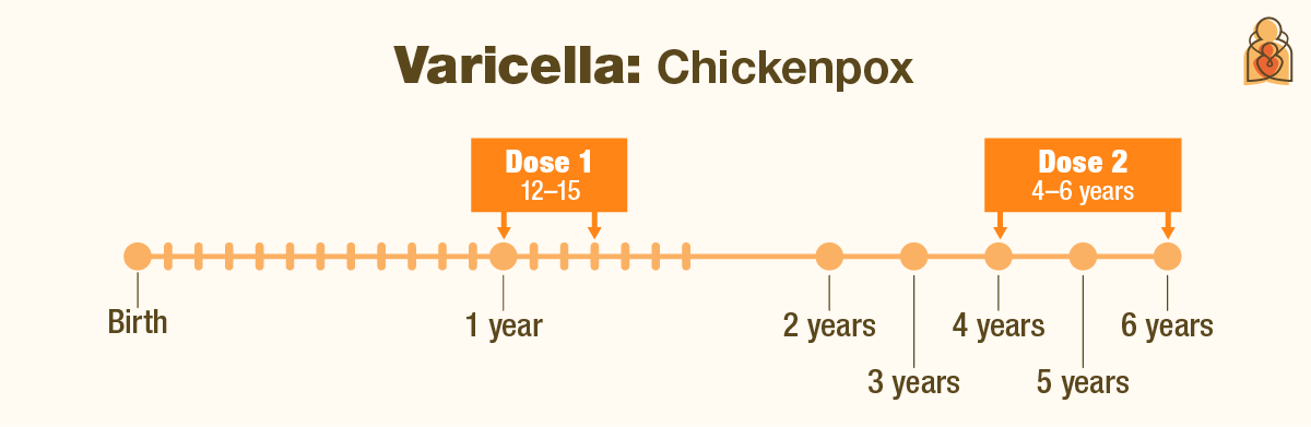 Varicella vaccine (2 doses) prevents "chickenpox," which used to infect 4 million people in the United States every year. More than 10,000 were hospitalized, and more than 100 died. A mild case can cause a child to miss school for a week or more. Usually, the MMR vaccine and varicella vaccine are given separately for the first dose. The MMRV vaccine may be used for the first dose instead if parents express a preference.