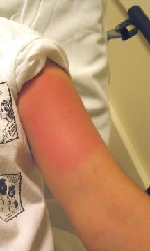 This photo shows a localized reaction to a bee sting. There is mild redness in an oval 4 inches (10 cm) wide of the left upper arm.