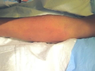 The photo shows a 6 inch (15 cm) wide area of mild redness without blistering on the forearm. This thermal burn was caused by spilled hot water.
