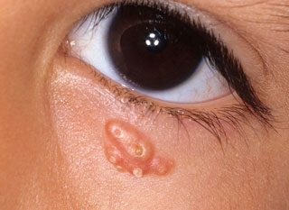 This shows an eye with an infection from the molluscum contagiosum virus. The growths are pink, white or pearly-colored. They are firm, small and raised with a dimple in the middle.
