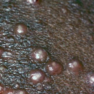 This shows an infection from the molluscum contagiosum virus. Molluscum is sometimes called a "water wart." The growths are pink, white or pearly-colored. They are firm, small and raised with a dimple in the middle.