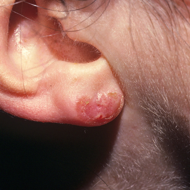 This shows a rash that was caused from a nickel allergy. The allergic rash is from the nickel (metal) in the earring. It is red, crusty and moist.