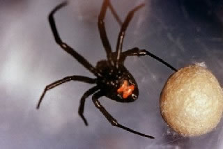 - The black widow is shiny and black, with long legs (total width 1 inch).