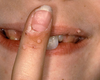 A wart is a growth caused by a virus. Warts can be spread easily as show in this picture. The wart was spread from the finger to the lip. Children often chew on warts which caused them to spread.