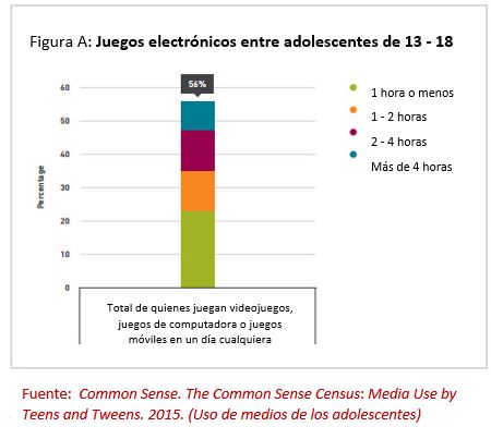 Jugar videojuegos califica como la segunda actividad favorita de los adolescentes en los medios; el 56 % de los adolescentes juega videojuegos, juegos de computadora o juegos móviles durante un día cualquiera. Esos adolescentes que juegan lo hacen durante un promedio de 2 horas y 25 minutos por día. Ver a continuación la Figura A.