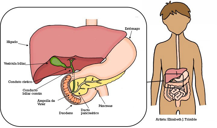 La vesícula biliar es un órgano ubicado al lado derecho del cuerpo, debajo del hígado. El hígado produce la bilis, un líquido que ayuda a digerir los alimentos.  La vesícula biliar almacena bilis. Cuando su niño come, la vesícula libera bilis a través de conductos que la conectan con el intestino.