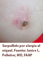 La reacción alérgica de la piel al níquel parece un eccema. Los signos y síntomas incluyen un sarpullido que pica, enrojecido, hinchado, que forma escamas y probablemente tenga apariencia costrosa. En general, el sarpullido aparece en el área de piel que entra en contacto con el metal. Si la exposición al metal es constante, a veces puede que aparezca sarpullido en partes más lejanas del cuerpo. Una vez que los niños se vuelven sensibles al níquel, les pueden salir sarpullidos cada vez peores cuando vuelven a exponerse al níquel.