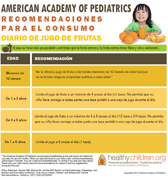 Los padres pueden ayudar ofreciendo porciones de jugo apropiadas para la edad, además de frutas enteras y otras bebidas, como el agua y la leche descremada o baja en grasa.