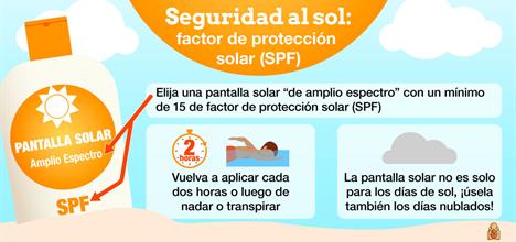 Use un protector solar de amplio espectro con factor de protección solar, FPS (sun protection factor, SPF) de por lo menos 15 (hasta SPF 50). Un FPS de 15 o 30 es apropiado para la mayoría de las personas. Es necesario realizar más estudios de investigación para evaluar si un protector solar con un FPS de más 50 ofrece protección adicional.