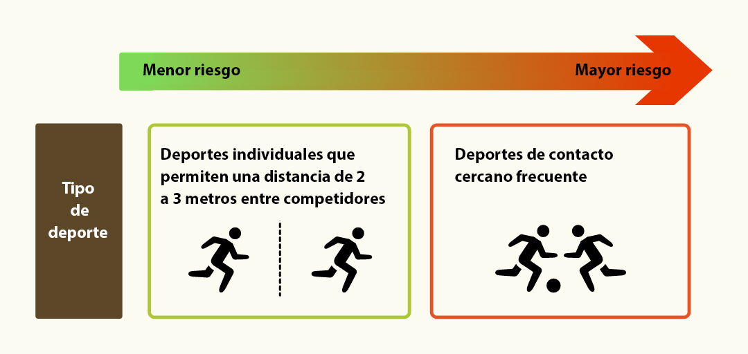 Los deportes y las actividades físicas en los que es posible la participación individual y el distanciamiento físico, tales como el golf o tenis individual, tienen menos riesgos que los deportes en los cuales hay mucho contacto cercano como el básquetbol o la lucha libre.