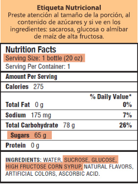 •  Lea las etiquetas nutricionales detenidamente. Muchos alimentos enumeran los azúcares agregados por separado. También puede ver los azúcares agregados en la lista de ingredientes. Trate de que el niño no consuma más de 25 gramos de azúcar agregado (cerca de 6 cucharaditas) al día, esto en el caso de niños mayores de 2 años. Evite darle alimentos y bebidas con azúcar agregado a niños menores de 2 años de edad. Conozca más sobre los cambios de la etiqueta nutricional aquí  .