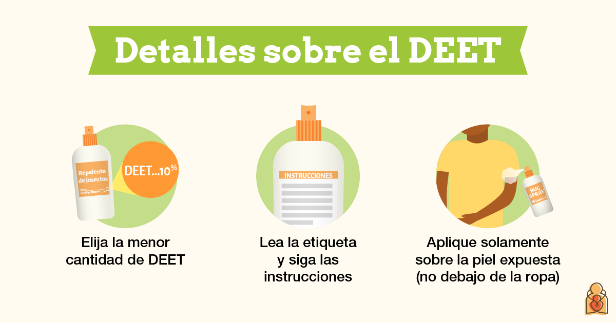 La American Academy of Pediatrics y los Centros para el Control y la Prevención de Enfermedades (CDC, por sus siglas en inglés) recomiendan usar un producto repelente de insectos que haya sido registrado por la Agencia de Protección Ambiental (EPA, por sus siglas en inglés). Estos productos contienen ingredientes como DEET, picaridina, aceite de eucalipto limón u otro ingrediente activo registrado por la EPA. Utilice esta herramienta para buscar repelentes de insectos registrados en la EPA.